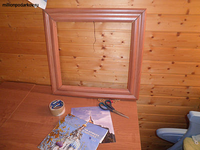 Чтобы сделать поделку для дачи своими руками, нужно взять деревянную рамку, широкий скотч и старый календарь.