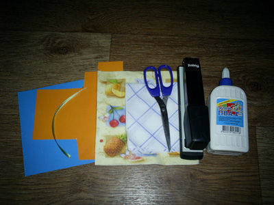 Примером поделки для детей 4 лет является изделие из мятой бумаги. Давайте сделаем цветочек. Для этого нам понадобятся салфетки двух цветов, цветной картон, атласная лента зеленого цвета, клей ПВА, ножницы и степлер.