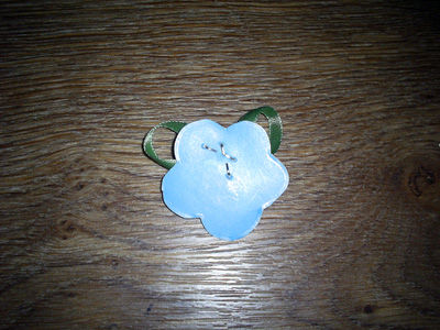 Вырезаем из картона основу цветочка. Отрежем от атласной ленты зеленого цвета два небольших фрагмента, сложим их вдвое и с помощью степлера прикрепим к картонному цветочку. Ребенку здесь потребуется помощь взрослого.