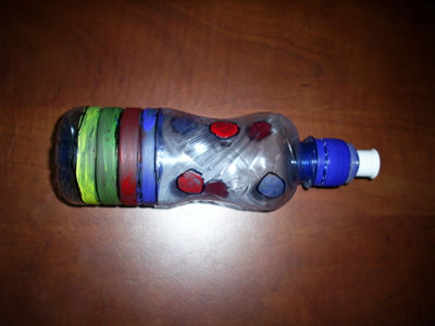 Снимем этикетку и разрисуем акриловыми красками бутылочку. Если погремушка предназначается для маленького ребенка, который все тянет в рот, то оставьте бутылочку не раскрашенной. К тому же плотно закручивайте крышку и давайте ребенку игрушку под Вашим присмотром.