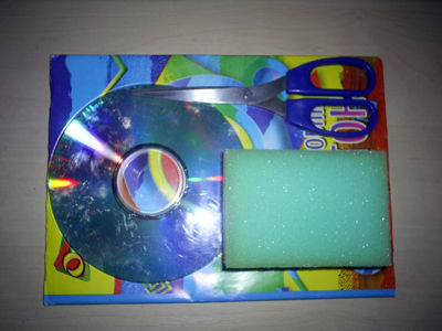 Для изготовления цветов нам понадобится кухонная губка зеленого цвета, картон, ножницы. А для того, чтобы красиво оформить нашу композицию, воспользуемся испорченным диском.