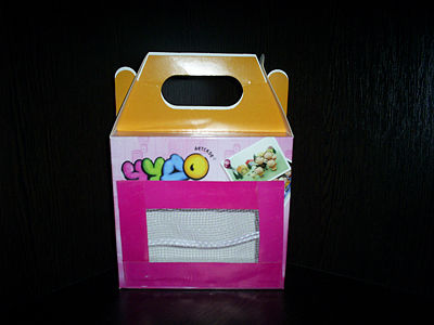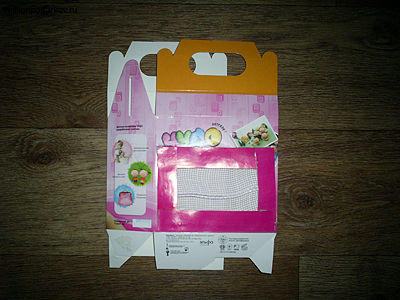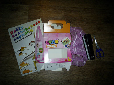 Для того чтобы сделать домик для переноски, нам понадобилась коробочка с окошком из-под детской косметики, цветочная сетка, степлер, ножницы и цветной картон.