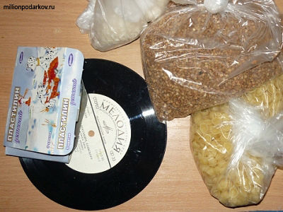 Найдите для этой поделки старую виниловую пластинку, достаньте пластилин, рис, пшено, макароны ракушки и простые трубочки.