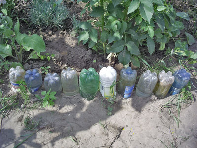 Итак, снимаем этикетки с бутылок. Выбираем подходящие по цвету варианты. Насыпаем в бутылки песок или наливаем воду. А теперь вкапываем нашу пластиковую тару в землю, создавая заборчик. Для этого вкопаем бутылки в ряд. Таким заборчиком можно оградить дорожку в саду, участок морковки от территории с капустой и т.д. Чтобы заборчик исполнял еще и декоративные функции, тщательно подходите к выбору бутылок и попробуйте насыпать в них цветной декоративный песок.