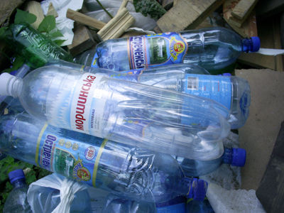 Для изготовления заборчика подготовьте несколько пластиковых бутылок, песок или воду.