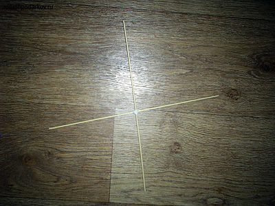 Берем два бамбуковых шампура и обрезаем острые кончики. Скрепляем палочки посередине плотными нитками.