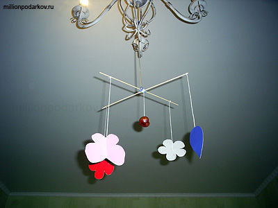 Итак, сделайте для детей разноцветный мобиль. Делать его мы будем из цветного картона, бамбуковых шампура и ниток с применением клея и ножниц.