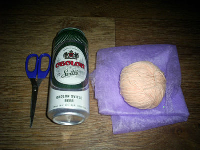 Для изготовления вазона вам понадобится жестяная банка из-под пива или лимонада, нитки, флористический флизелин и ножницы.