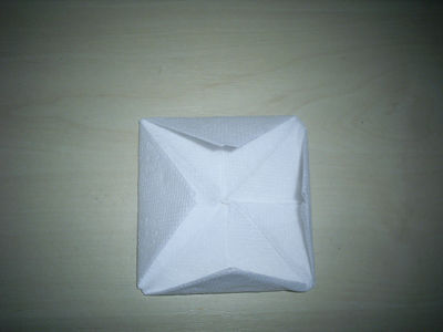 Разворачиваем нашу салфетку и складываем четыре угла к середине. Затем у получившейся фигуры опять складываем углы. Всего надо повторить так три раза. Затем переворачиваем салфетку и снова сгибаем углы к центру. Вот что в итоге должно у нас получиться.