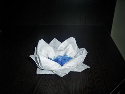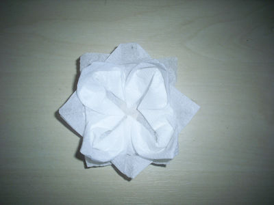 Кладем нашу поделку на стол и удерживаем пальцем уголки, чтобы они не раскрывались. Аккуратно начинаем расправлять нижние лепестки. Сначала расправляем самые верхние четыре уголка, затем те четыре, что лежат ниже, а в конце самые нижние уголки. Всего нам необходимо будет провести данную процедуру три раза. Вот какой цветок у нас получился. Уже эту поделку можно использовать в сервировке стола, кладя возле тарелок вместо обычных салфеток. Но кувшинку можно дополнительно украсить, сделав ей сердцевину.