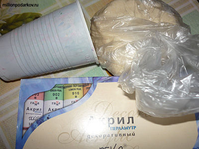 Для того, чтобы у нас получилась поделка елочка из соленого теста нам потребуется акриловые краски, кисть, стакан с водой и соленое тесто, которое состоит из соли "экстра" и муки в равных пропорциях, с добавлением небольшого количества воды. Когда тесто замешано его помещают в холодильник на пару часов, после этого можно лепить.