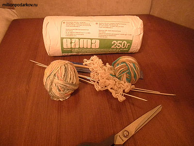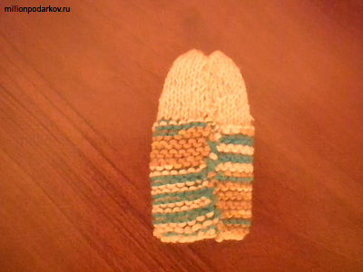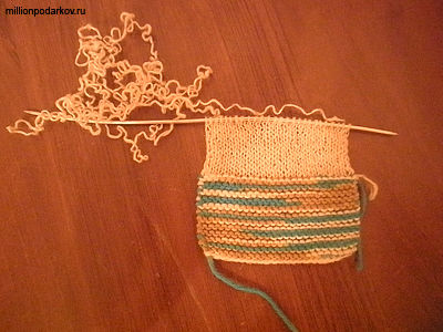 Для этого набираем 25 петель синего цвета, провязываем около 25 рядов, а затем продолжаем работать нитью телесного цвета и вяжем еще около 15 рядов.