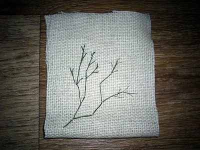 Теперь приступаем к вышивке. Для этого нам понадобятся нитки мулине зеленого цвета и тонкие белые атласные ленточки. Сначала вышиваем стебелек. Для начала нитки мулине протираем мылом, смоченным водой. Основу стебелька делаем в четыре нити, затем закрепляем их с изнанки и продолжаем вышивать стебель уже в две нитки. Ответвления делаем в одну нить. Получается вот такая веточка.