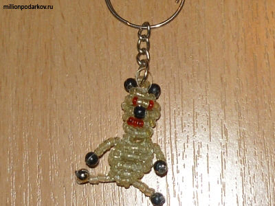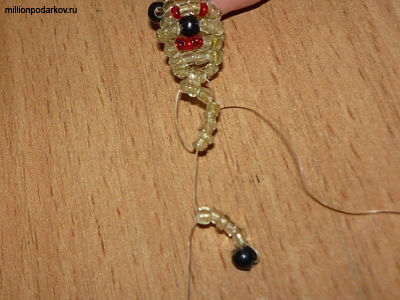 Низаем нижние лапки. Для этого набираем 7 бисеринок и одну бусину на леску, а затем перекидываем леску и продеваем её в бисеринки возвращая леску в точку начала лапки. Таким же образом собираем и вторую лапку. Затем набираем на леску 2 бисеринки и закрепляем, завязываем узелок. После этого крепим к мишке колечко для ключей. Наш брелок готов!