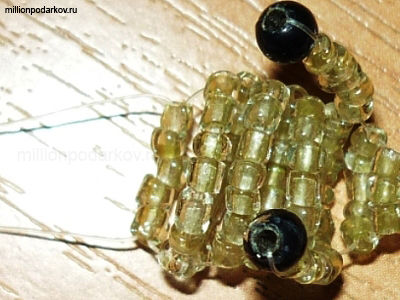 Набираем ряд в 5 бисеринок. Затем набираем ещё один ряд в 5 бисеринок и продеваем один конец лески навстречу другому, так как показано на картинке. Затем надеваем на концы лески по бусине - это будут уши у медведя.