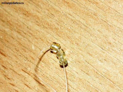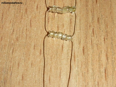 Низать бусины будем с головы нашего медвежонка, начиная с петли. Набираем три бусины в ряд, затем ещё три бусины, и во вторую тройку бусин продеваем один из концов лески, навстречу другому.