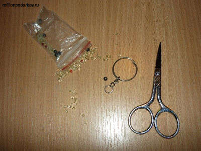 Приготовьте бисер, бусины, ножницы, кольцо с цепочкой для брелка и леску.