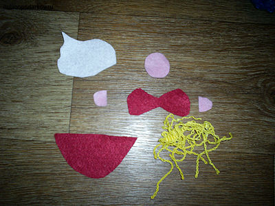 Из красного фетра вырежем туловище-платье ангела, руки. Из розового фетра сделаем лицо и ладони. Из белого материала вырежем крылья. Желтая тесьма будет выступать в качестве волос.