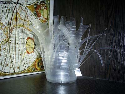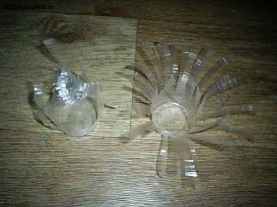 Отрежьте сверху от стаканчиков кружек пластика. Затем нарежьте их полосками шириной по 0,5-1 см. В одном стаканчике загните полоски наружу, а в другом – вовнутрь. Для этого по полоскам можно провести тупой стороной лезвия ножниц.