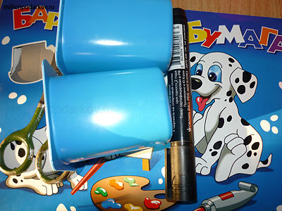 Для того, чтобы у нас получилась поделка из бросового материала "Собачка" вам потребуется 2 пустые баночки от йогурта, клей "Момент", маркер черный, бархатная бумага, ножницы.