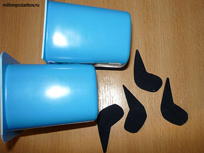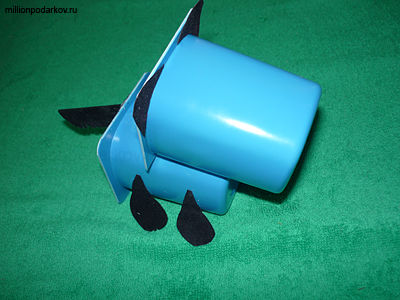 Склеиваем стаканчики, поставив их друг на друга. Вырезаем из бархатной бумаги детали для собачки.