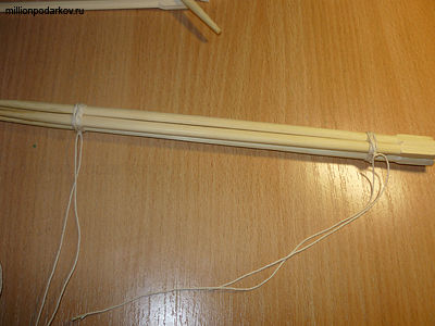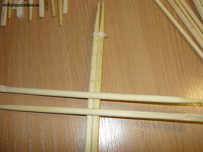 Начинаем собирать ёлку со ствола. Возьмите 4 деревянных палочки для еды, сначала склейте их между собой клеем "Момент", а затем свяжите нитками с двух сторон.