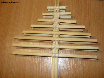 Когда все части кроны будут готовы, обмотайте палочки нитками для прочности. Затем откусите плоскогубцами лишние концы у палочек и придайте кроне треугольную форму.