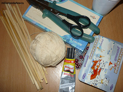 Для поделки вам потребуется 20 деревянных палочек для еды, клей "Момент", мишура, нитки, баночка от йогурта, пластилин, краски акриловые, бусины, стаканчик с водой, кисточка, ножницы, плоскогубцы.