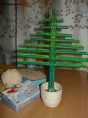 Делаем баночку подставку. Для этого мажем клеем пустую баночку от йогурта, а сверху баночку обматываем нитками. Когда клей подсохнет наполняем баночку пластилином. В него мы потом будем втыкать ствол ёлки.