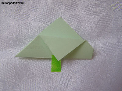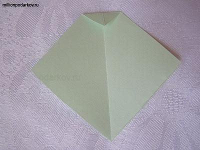 Для изготовления нашей поделки из бумаги без клея нам понадобится квадратный лист бумаги, который мы сгибаем по диагонали, после чего загибаем средний угол как показано на фото