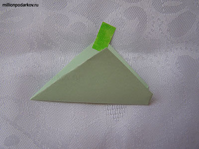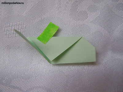 Загибаем верхний угол к низу, как показано на фото. Тоже самое проделываем и с другой стороны.