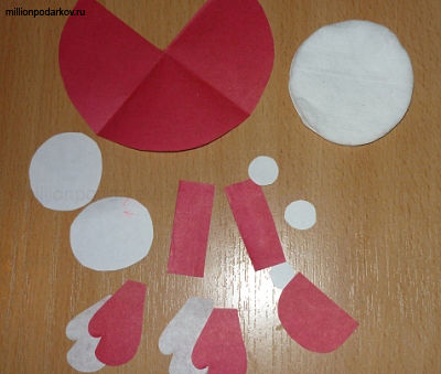 Вырежете из листа бумаги красного цвета детали для нашего деда Мороза. Для этого сначала нанесите на обратную сторону листа схему частей нашей поделки. Необходимо будет вырезать из красной бумаги руки, варежки, шубу деда Мороза и шапку. Затем из листа белой бумаги вырежьте лицо и пуговки для шубы деда Мороза.