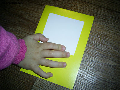 Просим ребенка сложить лист цветного картона пополам, разрезать по линии сгиба и сложить еще раз. Приклеиваем квадратик из белой бумаги на двухсторонний скотч.