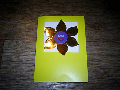 Рисуем на обратной стороне металлизированной цветной бумаги цветочек, просим ребенка вырезать его. Приклеиваем кружок из цветного картон, глазки на клей ПВА. Просим ребенка сделать ротик из пластилина. Вот такая оригинальная открытка у Вас может получиться в итоге.