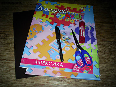 Для того чтобы сделать смайлик, нам понадобятся такие материалы, как набор флексики, черный маркер, ножницы, клей, магнит листовой самоклейка, бегающие глазки.