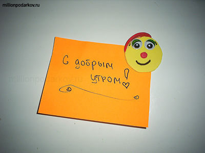 Приклеиваем к мордочке-основе смайлика шапочку, носик, глазки. Черным маркером рисуем ротик и бровки. Вот и все. Осталось на яркой бумажке написать пожелание близким и прикрепить его магнитиком к холодильнику.