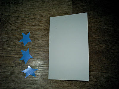 Сложим лист картона пополам. Из цветной бумаги вырежем звездочки.