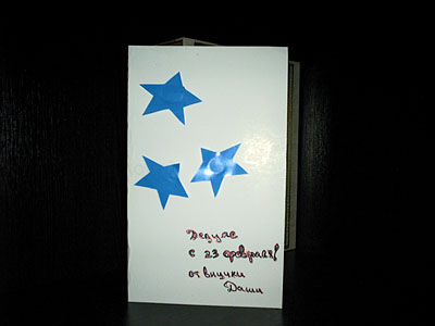 Наклейте на открытку вырезанные звездочки. Подпишите ее фломастерами. Мы подарим нашу поделку дедушке.