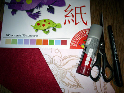 Для изготовления открытки подготовьте такие материалы, как бумага для оригами, пальчиковый клей, ножницы, черный маркер, фетр, нитки. Также нам понадобится и бумага для скрапбукинга с цветочным рисунком или с сердечками.