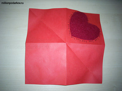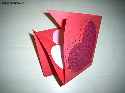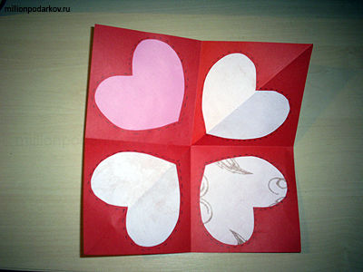 Складываем открытку. Вот как она выглядит в итоге. Внутри на сердечках можно писать пожелания и слова любви.