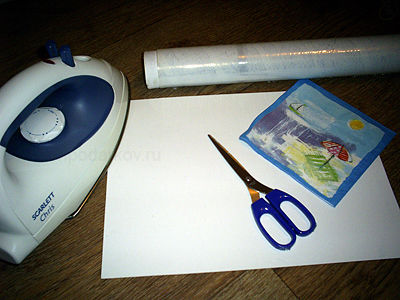 Итак, для того, чтобы делать поделки из бумаги на морскую тему, нам понадобится трехслойная салфетка с морским рисунком, ножницы, лист белого картона, пищевая пленка, утюг, лист белой бумаги.