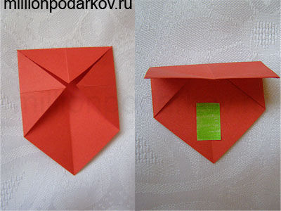 Переворачиваем нашу заготовку и загибаем верхние угли к средней линии, дальше загибаем боковины под треугольные карманы на переднем плане, как показано на фото.