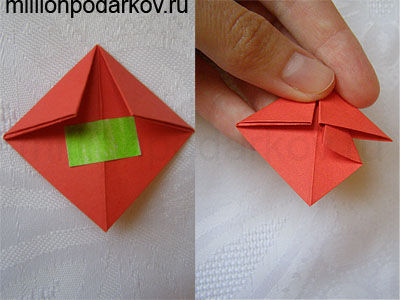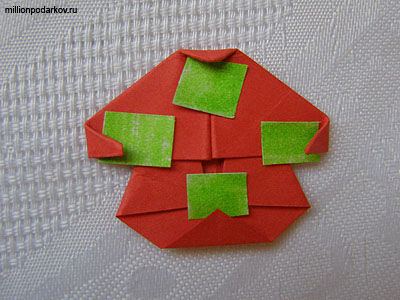 Чтоб придать форму нашему грибку нам нужно немного по загибать уголки сверху и снизу, как показано на фото. Переворачиваем нашу поделку из бумаги оригами и все, наш грибок готов!