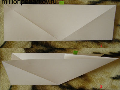 Для нашей поделки из бумаги оригами "Мотылек", берем лист бумаги в форме квадрата который перегибаем по двум диагоналям, после чего сгибаем пополам и заворачиваем треугольники вовнутрь, как показано на первом фото. После этого загибаем получившиеся треугольники вниз.