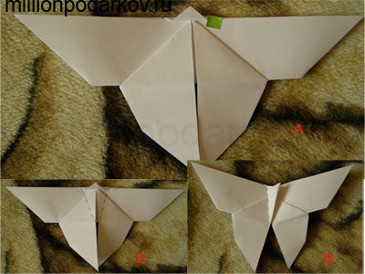 Теперь формируем мордочку нашего мотылька, сделав двойной загиб верхнего треугольника, как показано на фото А. После делаем загибы по линии на фото Б, В