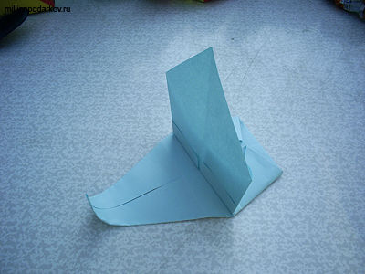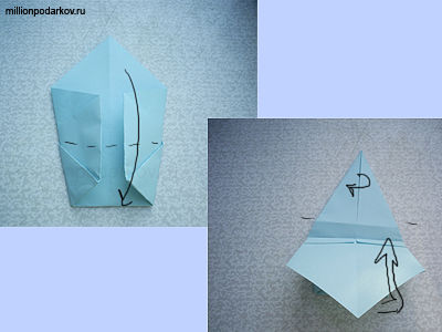 Складываем фигуру по линии, как на фото 1. Затем отгибаем парус вверх, а носик заворачиваем.