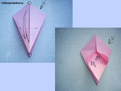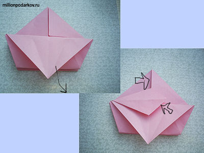 С двух сторон перегибаем нижние углы к верхним углам по намеченным линиям. Раскрываем нижнюю часть фигуры, как указано на втором фото.