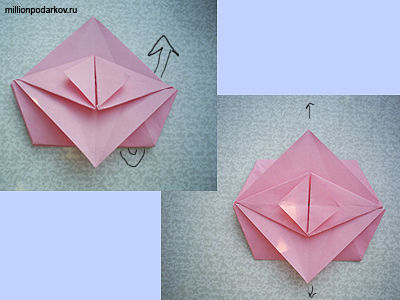 Поднимаем нижнюю часть верх и у нас получается вот такое тато. Потяните за противоположные уголки, и оно раскроется. Такие поделки из бумаги оригами, схемы, приведенные к ним, помогут Вам освоить эту чудесную технику.