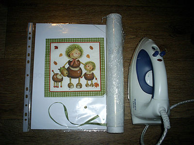 Кладем на белую сторону салфетки пищевую пленку, стараясь, чтобы не образовались складки. Затем сверху кладем нашу вырезанную салфетку. Проглаживаем все это утюгом через лист белой бумаги. Затем, если салфетка плохо приклеится, можно прогладить поделку без листа-прокладки.