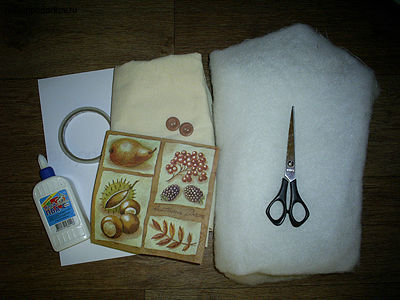 Для того чтобы сделать открытку, нам понадобятся такие материалы, как трехслойная салфетка с рисунком, клей ПВА, двухсторонний скотч, ножницы, синтепон, ватман, швейная машинка, суровая бязь.